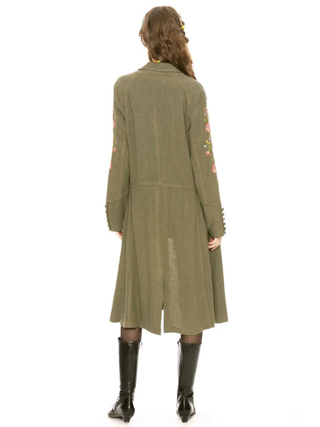 Love this coat!! Unlined button closure coat with 2 front flap pockets, embroidered sleeves with embellished embroidered trims on sleeve cuffs, back hem slit. Olive color!