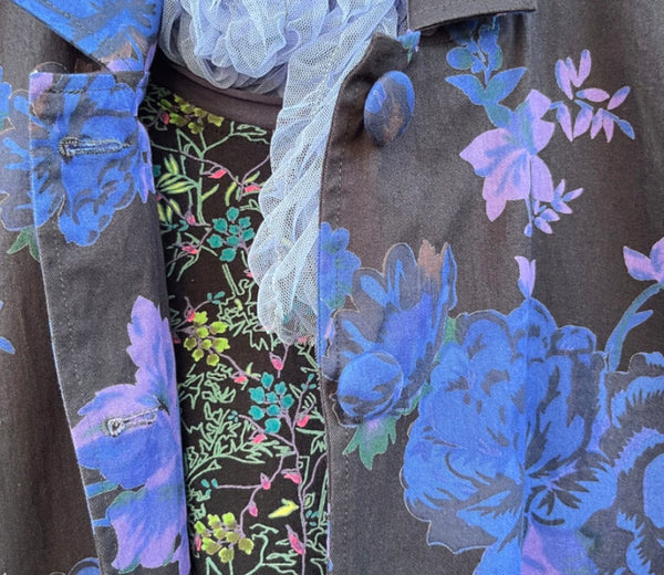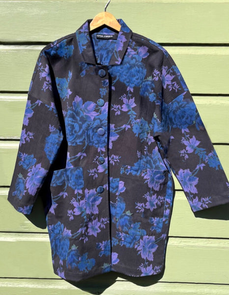 Our floral twill in shades of cobalt and lavender has an oversized drop shoulder silhouette perfect for layering. With a bit of lycra there’s stretch in the fabric too. Two front patch pockets. Unlined. Length approximately 34” long. Little Journeys Chicago Studio Print.