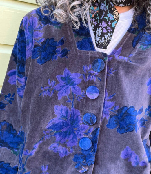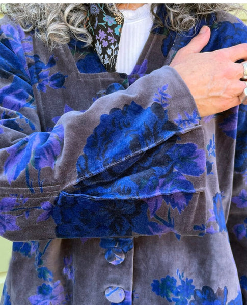 Floral statement coat in shades of cobalt and lavender is detailed with fluted cuffs and side pockets. Fully lined, beautifully finished. 100% cotton velvet, length approx 30″, dry clean. Made in India. A Little Journeys Chicago Studio Print.