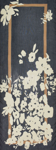 This soft modal scarf features an oversized floral design with a framed border, blending classic black, white, and brown tones for a chic, neutral look.