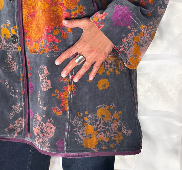 Soft A-shape silhouette envelopes you in charcoal gray with jewel tone red florals. Cozy and delightfully flattering. Charming details of over stitched seams, pockets and viscose trim finish the look. Fully lined, beautifully finished. Length approx 33".