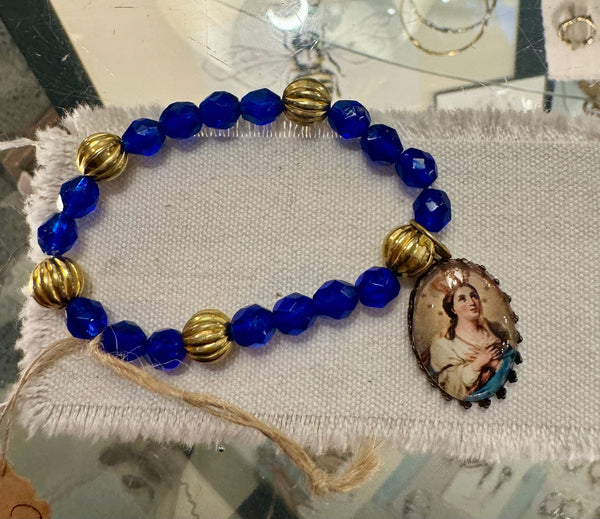 Stunning bracelet with blue and gold beads, with an oval pendant featuring an image of Mary. Designed by Leslie Crowley.
