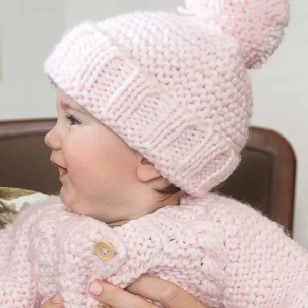 Thick, soft beanie in is hand knit in garter stitch with a ribbed cuff and pom pom on tip. Hand-knit, in blush pink yarn, it is cozy and warm!