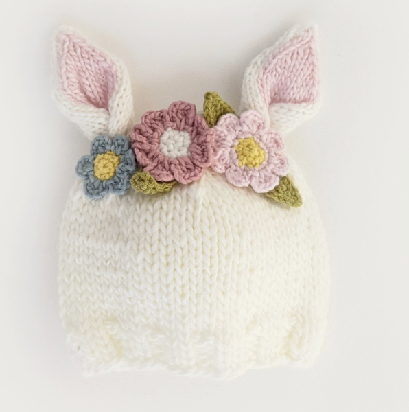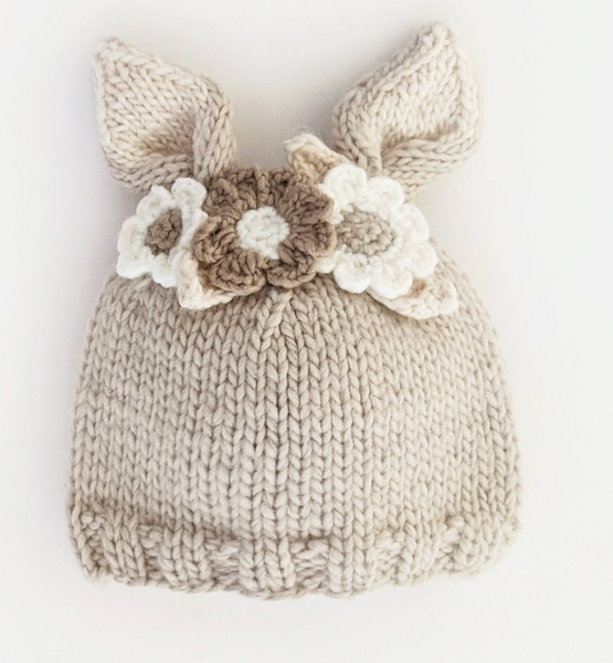 This cozy hand-knit beanie in Oatmeal or White features adorable stand-up bunny ears lined with natural yarn and decorated with a charming flower garland in soft shades. So cute!!