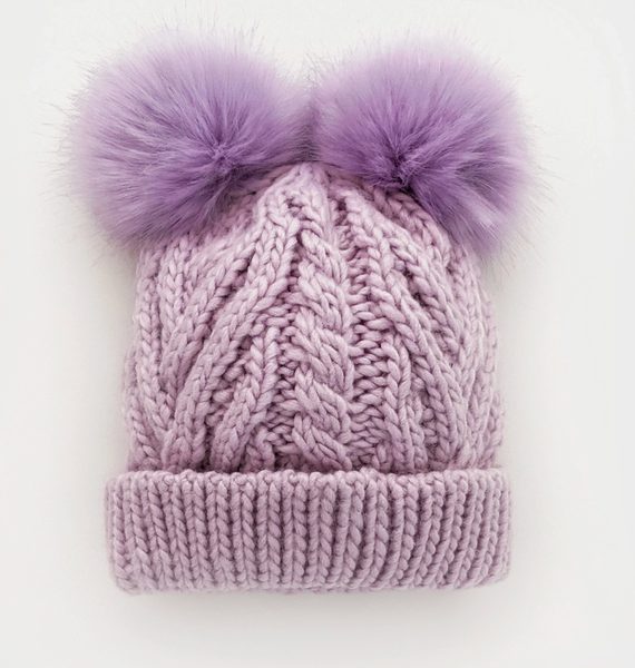 This sweet cable knit hat is topped with 2 dyed-to-match furry pom poms. It is just the cutest hat ever in a beautiful shade of lilac!