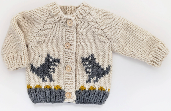 Hand-knitted, cozy T-Rex cardigan made from soft, Natural-colored yarn. Featuring wood buttons and two T-Rex dinos on the front in a playful Grey and Saffron color scheme, complete the look with our matching T-Rex beanie!