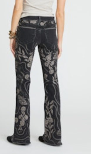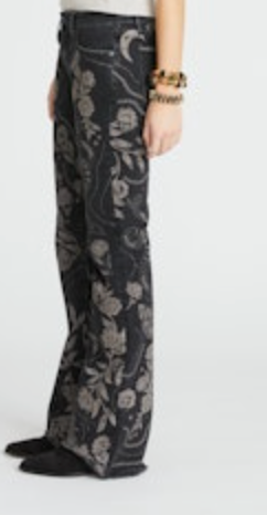 Love these jeans! Bootcut fit jeans with a fun "phantom hallucination" pattern throughout. Black color.