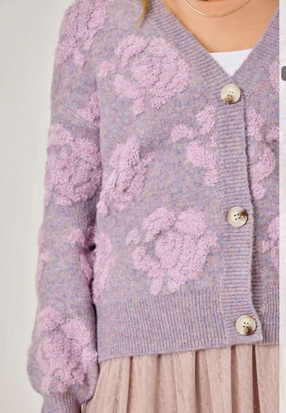 Such a pretty color! This cardigan has a fun floral pattern, puff sleeves, and front button closures. Snuggly and warm for cold weather!