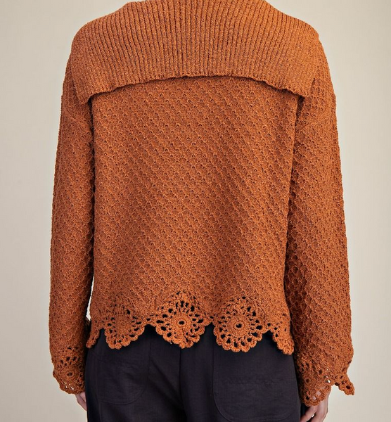 Love this sweater for fall! Crochet style textured fabric, relaxed loose fit, scalloped crochet hem with floral pattern. V neck line with lace up tie closure.