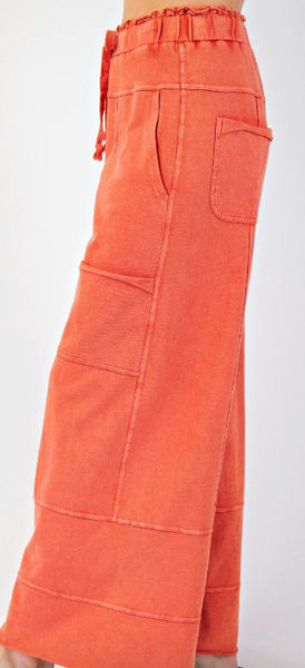 Love this easy breezy style! Mineral washed, terry knit wide leg pants. Comfy elastic waistband, side and cargo pockets, fun colors! Perfect for travel, class, or lounging!